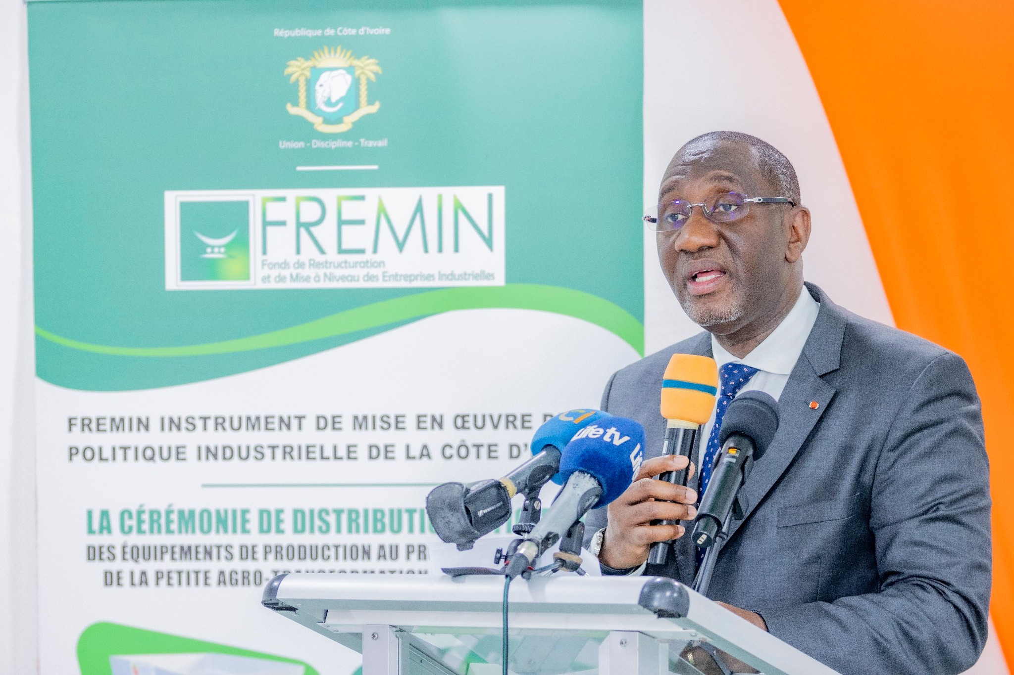 Composés de broyeurs d’épices, de céréales et de manioc ; d’extracteurs de jus, de torréfacteurs ; de pasteurisateurs et de séchoirs en faveur de 12 bénéficiaires ( dont 11 femmes) de Yamoussoukro et d’Abidjan, la remise de ces 22 équipements s’inscrit dans le cadre du programme d’appui aux acteurs de la petite transformation, initié par le Gouvernement pour un coût de plus de 2 milliards Fcfa, afin de soutenir 1 000 acteurs dudit secteur.