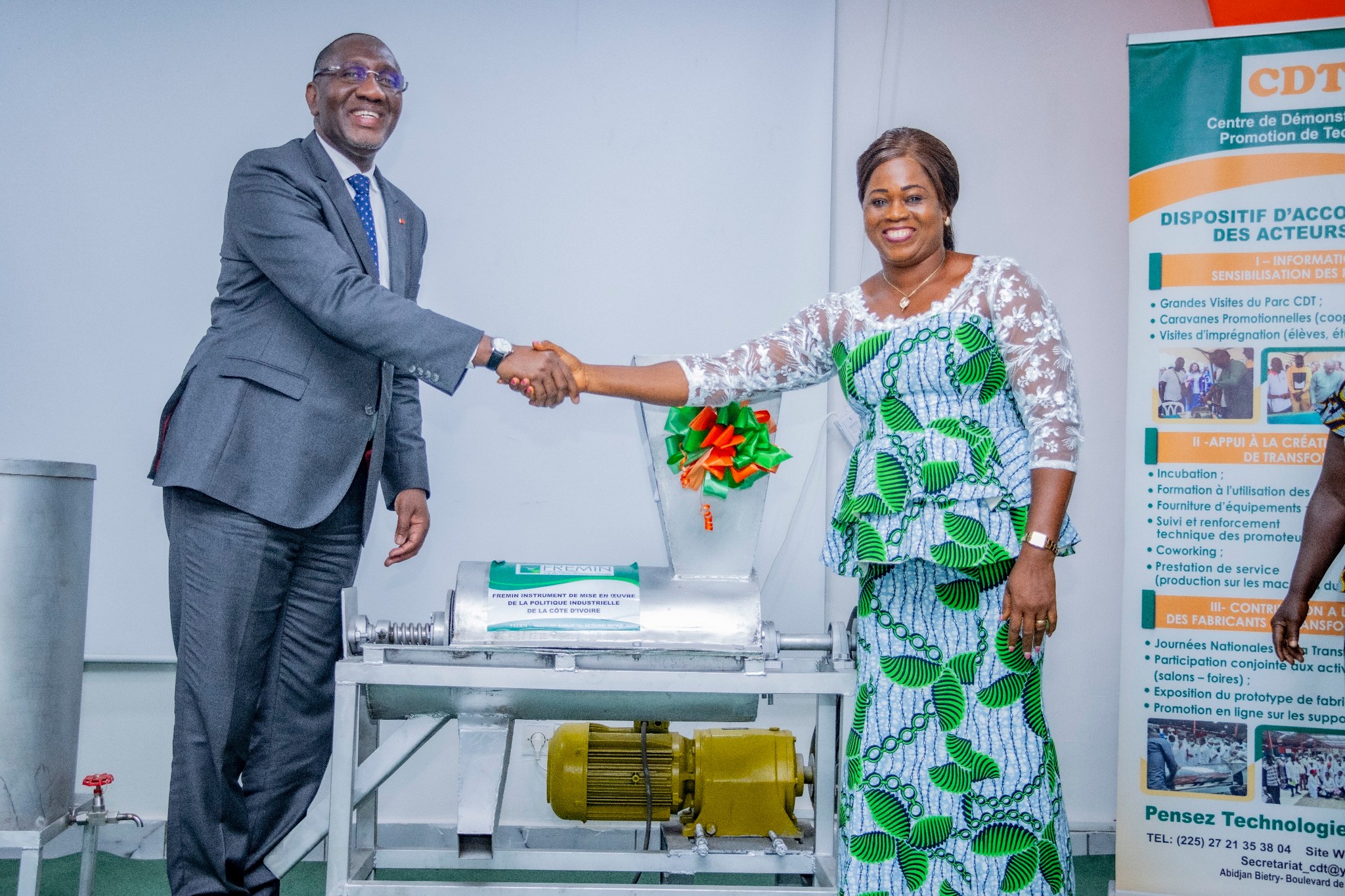 Composés de broyeurs d’épices, de céréales et de manioc ; d’extracteurs de jus, de torréfacteurs ; de pasteurisateurs et de séchoirs en faveur de 12 bénéficiaires ( dont 11 femmes) de Yamoussoukro et d’Abidjan, la remise de ces 22 équipements s’inscrit dans le cadre du programme d’appui aux acteurs de la petite transformation, initié par le Gouvernement pour un coût de plus de 2 milliards Fcfa, afin de soutenir 1 000 acteurs dudit secteur.